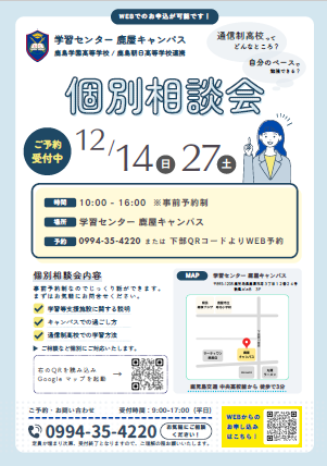 個別相談会実施します! 2025-11-06 お知らせ 学習センター 鹿屋キャンパス 12月に個別相談会を実施します。 事前予約制になりますので、周りを気にせずゆっくりとお話できます。 通信高校ってどんなとこ? 学費が気になる… キャンパス内を見てみたい! 進路の選択肢を増やしたい!など お気軽にお問い合わせください。 一覧へ