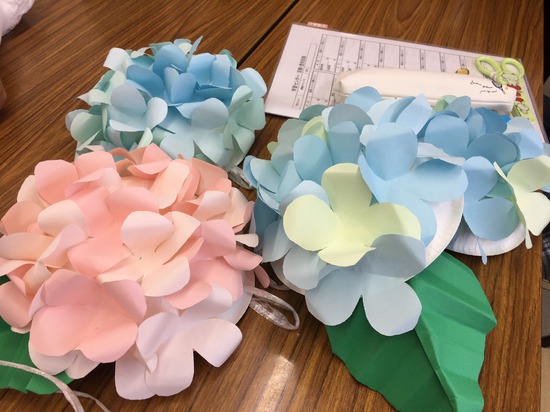 テーマは「梅雨」です。折り紙など使って、一つひとつ丁寧に紫陽花や傘などの装飾作りを行いました。
