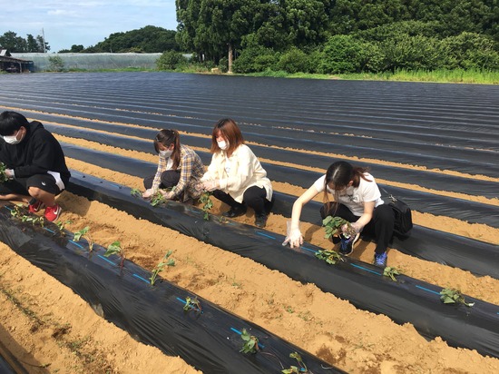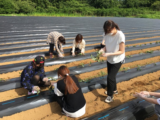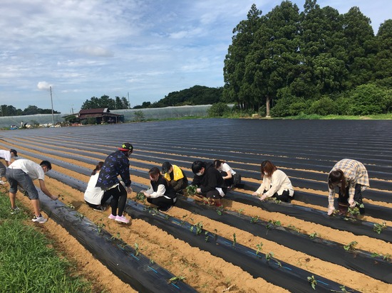 秋の収穫に向けて、香取市にある農園の一部をお借りしサツマイモの苗植えの体験を行いました。今回の特別活動は、鹿島学園高等学校の全日制に通う留学生と一緒に行う初めての企画です。