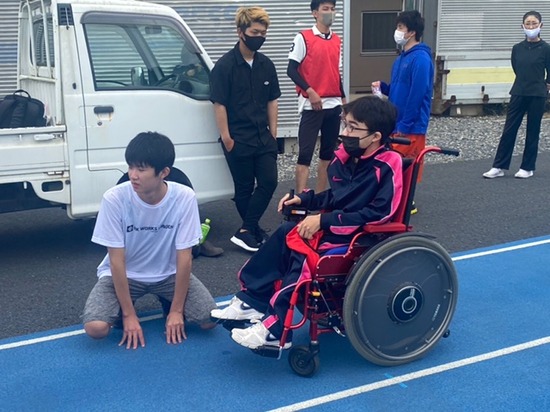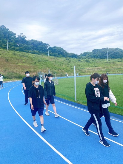 まずは、キャンパスの仲間と談笑しながら、グラウンドを2周して体をほぐしました。