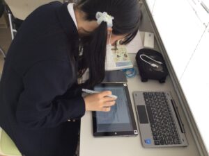今年度入学した生徒は、タブレットでレポート提出をしています。