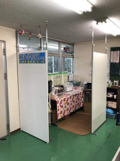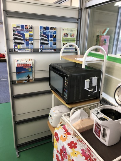 ホームルーム教室の一角に給湯コーナーがあり、レンジでお弁当を温めることができ、お湯を入れてスープやお茶を飲むこともできます。