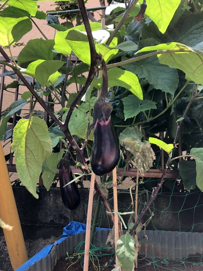 キャンパス玄関わきの畑とは思えないほど、大きなナス、キュウリができました!!