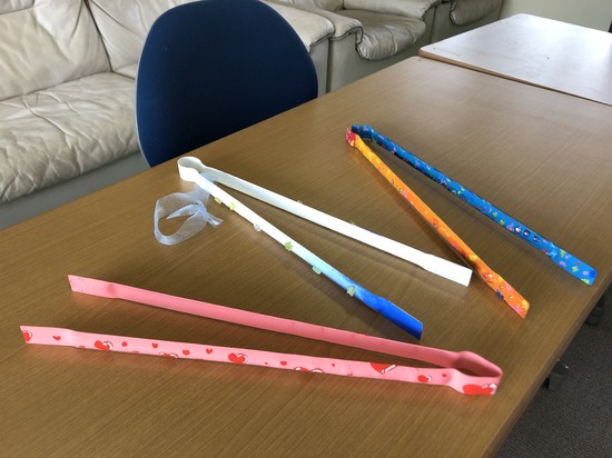 ゴミ拾いで使っていた金ばさみ(トング)をカラフルにペイントしたり、デコレーションを工夫したりしてオリジナル作品に仕上げました。