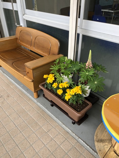 校舎入口に花壇をDIY手作りしたり,プランターを教室前に設置して黄色のマリーゴールドやピンクの鉢植えで華やかに彩ったりしています。