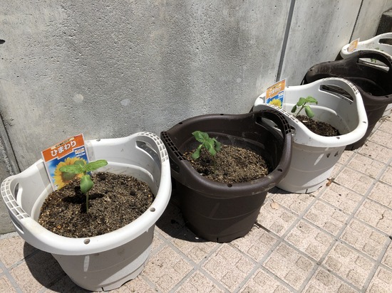 鉢に植えたひまわりも発芽したので,別の校舎前花壇に植え替えてそれぞれの株がぐんぐん生長しています。