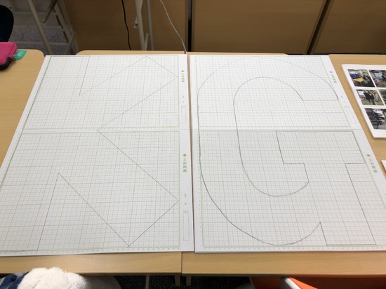 『K・G T・O・R・I・D・E』の8文字の中に写真を貼り付けていき,どんな校名パネル作品に仕上がるか,楽しみです。