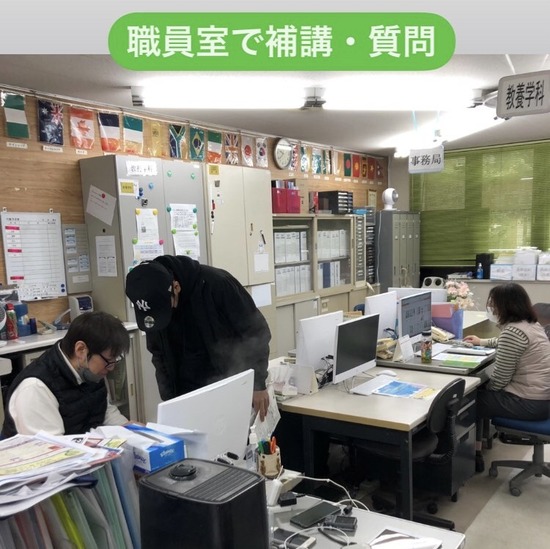 お知らせ KG取手通信制サポートキャンパスある日の職員室での1コマ・・・併設校の教養学科の学生が補習内容の質問に来ていました。