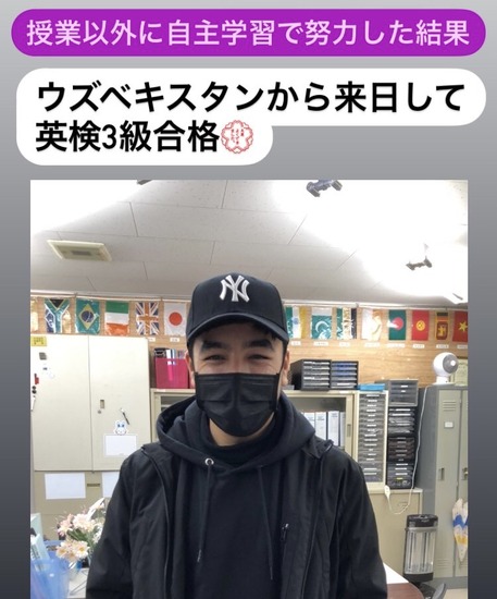 ウズベキスタンから来ている彼は,補習・独学で英語を学び,先日英検3級に合格しました。