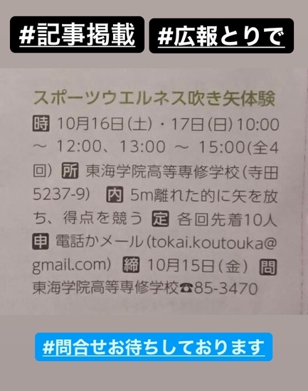 記事掲載情報(お知らせ) 10/16(土)、17(日)に開催するスポーツ吹矢体験イベントについて、「広報とりで」に記事が掲載されています。