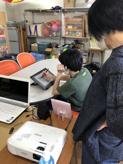 こちらの写真は,通っている専門学校の授業の合間にやってきた卒業生で,学んでいるペンタブでデジタルイラストを描いている様子です。