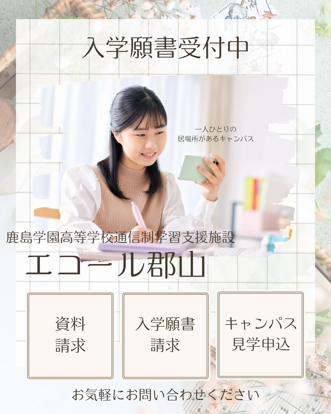 2026年度新入学生願書募集中🌸 2026-02-26 お知らせ エコール郡山 エコール郡山では 現在2026年度新入学生の募集をしております🌸もちろん、転編入学生も随時受付中です!お電話、メール、HPからのお問い合わせの他、InstagramのDMからもお問い合わせを受け付けております。資料請求やキャンパス見学申込等、お気軽にご連絡ください😊 一覧へ