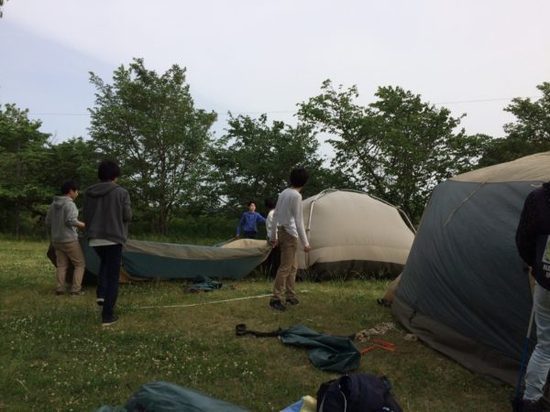 3つのテントを組み立てていると、遅れて先輩2名が食料をもって合流しました!そう、我らがいもきちちゃんです。
