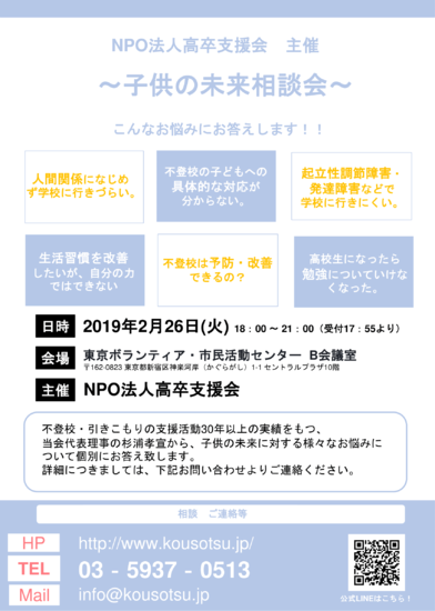 2月保護者会 子供の未来相談会 2019-02-16 お知らせ KG高等学院 水道橋 日時:2018年2月26日(火) 18:00 ~ 21:00(受付17:55より) 場所:東京ボランティア・市民活動センター B会議室 〒162-0823 東京都新宿区神楽河岸(かぐらがし)1-1 セントラルプラザ10階 主催:NPO法人高卒支援会 <お問い合わせ> LINEからのお問い合わせ メール:info@kousotsu.jp 電話:03-5937-0513 一覧へ