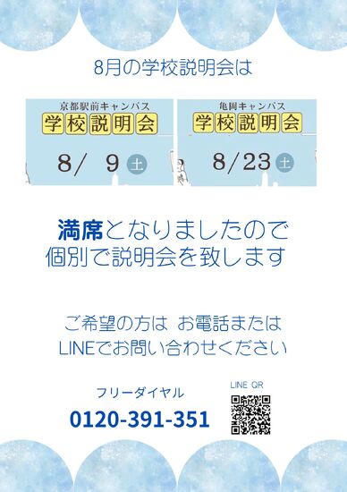 ☆学校説明会のお知らせ☆ 2025-08-01 お知らせ KG高等学院 京都駅前 こんにちは!京都駅前キャンパスです❣ 8月9日と23日に京都駅前キャンパスの学校説明会を開催致します! 当日は、ご予約でお席は満席となりましたが、大丈夫です! 個別で対応させて頂きますので お気軽にお電話・LINEでお問合せください! 0120-391-351 一覧へ