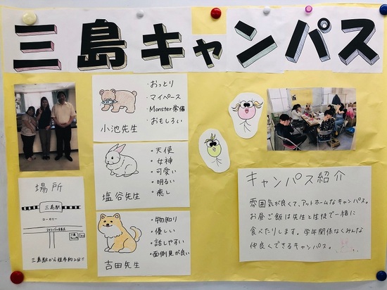 内容は「キャンパス紹介」です。模造紙いっぱいに三島キャンパスの特徴等を紹介する企画です。