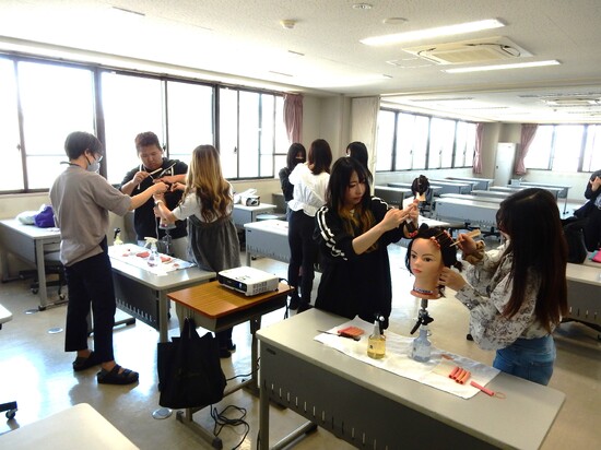 美容ではパーマの巻き方を習ったり、コンピュータではプログラミングの入力をしたり、生徒たちは各々興味のある分野の教室に赴き真剣に取り組んでいました。