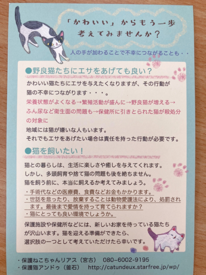 宮古市はとても野良猫が多いそうです。可愛いと思い、野良猫にエサを与える行為が可哀想な猫たちを増やすことに繋がってしまうそう…命について考える機会になりました。