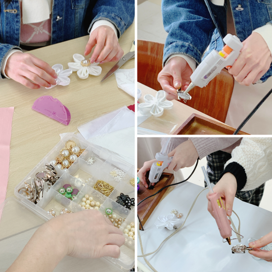 お花の中心にビジューの飾りをグルーガンでつけて仕上げ。