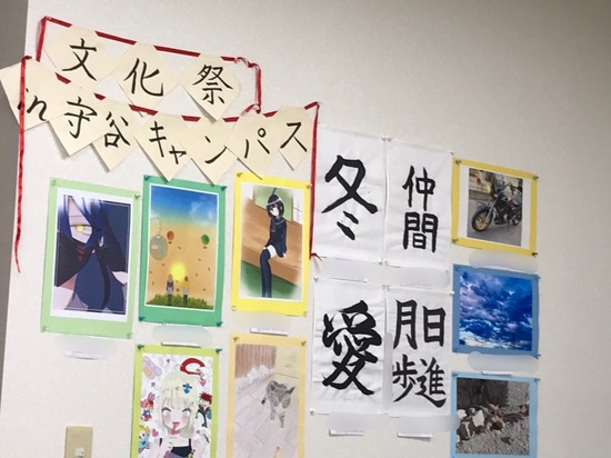キャンパスでイラストや書道、写真などの生徒たちの作品を募集し、フリースペースに飾っています!