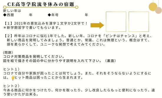 課題の中の一つは、2021年の意気込みを漢字1文字か2文字で書いてもらうというものでした。