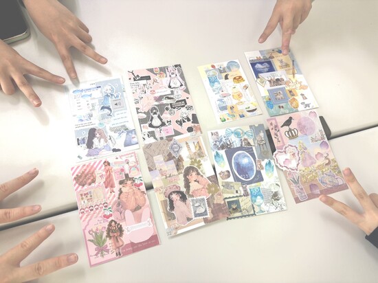 沢山ある素材の中から、自分に合ったデザインペーパーやシールを丁寧に切ったり破いたりしながら作成していく生徒たちが一生懸命で、可愛らしくて思わずくすっとしてしまった私です(笑)