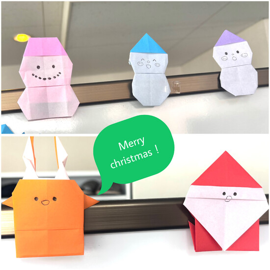 三年生の生徒さんが真剣に折り紙を折ってくれて、出来上がったのが写真の雪だるまたちと、サンタさん🎄