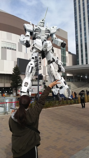 お台場の街中のビルの間を歩き、ガンダムを見、