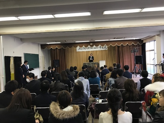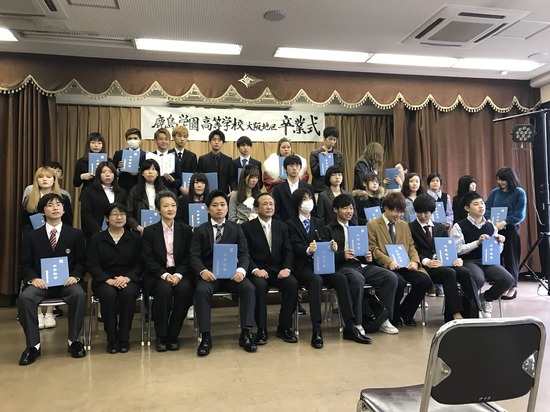 卒業おめでとうございます。(エミールほか大阪地区卒業式) 2018-03-20 お知らせ 大阪中央エミール高等学院 3/19月曜日、エミール大阪中央キャンパスほか、懇意のキャンパス合同で大阪地区卒業式を実施しました。 タイトル写真は、エミール関係の参加生徒と私(代表)です。 学園長からは、個別に卒業証書授与の後、祝辞をいただきました。 学園長、参加教員、参加生徒の集合写真です。 卒業式後、軽食会を行いました。 一覧へ