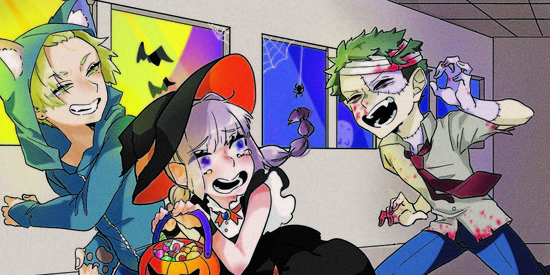 1面イラストは、学びリンク・□さん。 「ハロウィンパーティーでお化け登場!」