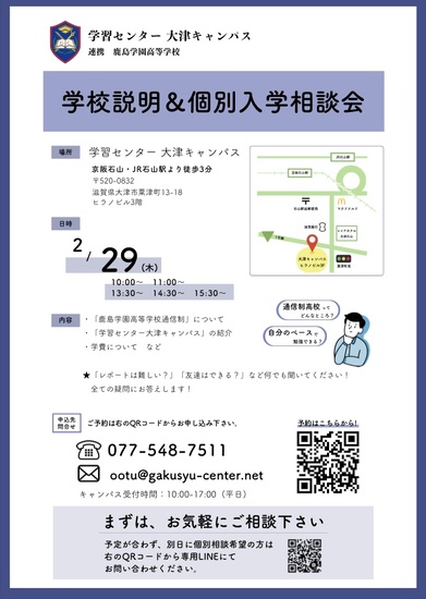学校説明&個別入学相談会を実施します 2024-01-22 お知らせ 学習センター 大津キャンパス 受付終了しました 相談ご希望の方は、随時対応いたしますのでお気軽にお問合せください 2/29(木)に学校説明&個別入学相談会を行います。 ぜひお気軽に、お申込みください。 一覧へ