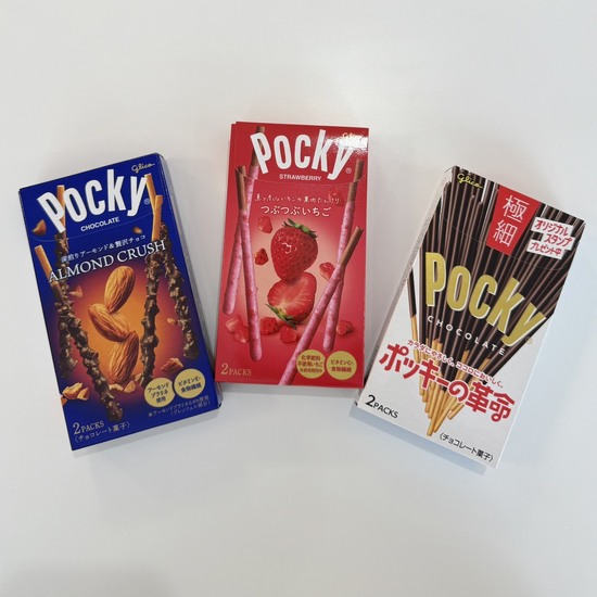 キャンパスでも3種類のポッキーを買って、ささやかな「ポッキーパーティー」を開催♪