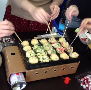 おしゃべりしながら、たこ焼きをクルックルッとね。