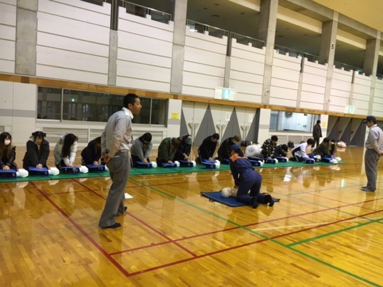 AEDを用いた心肺蘇生法、止血法、異物除去法のデモンストレーションのあと、みんなで実技演習を行いました。