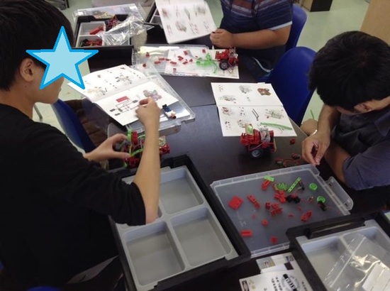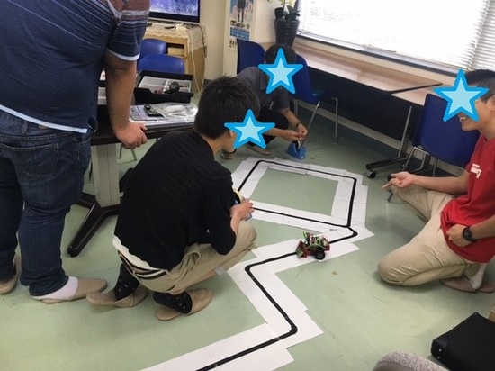 黒い線の上を動くようプログラムされたロボットを組み立てた後、オリジナルのコースを作って走らせる!