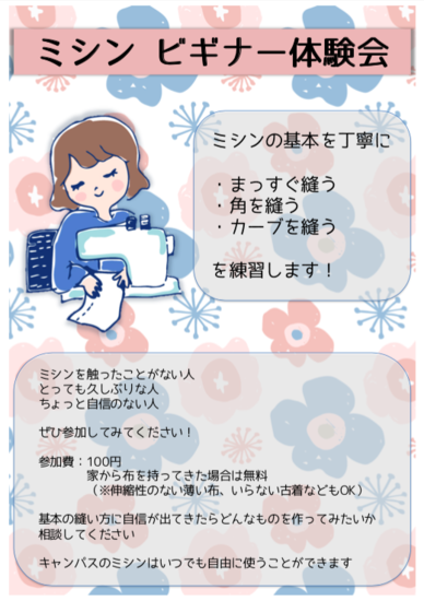 また、すでにミシンを使える生徒さんは、キャンパスのミシンを自由に使ってください