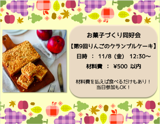11月のお菓子作り同好会は・・・? 2019-10-25 イベントのお知らせ KG高等学院 小山 11月のお菓子作り同好会は・・・ 【りんごのクランブルケーキ】です! タルト生地、ケーキ生地、甘く煮たりんご、クランブル 4つのパーツを組み合わせた贅沢なケーキです アップルパイとはちょっと違った秋のりんごの楽しみかたを一緒に味わいましょう✨ 興味がある方は先生まで! 随時連絡が来るLINEグループもありますよ✨ 【 加賀谷 】 一覧へ