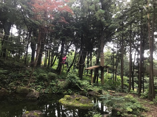 いきなり、ターザンロープで池の上を渡るというコース( ゚Д゚)