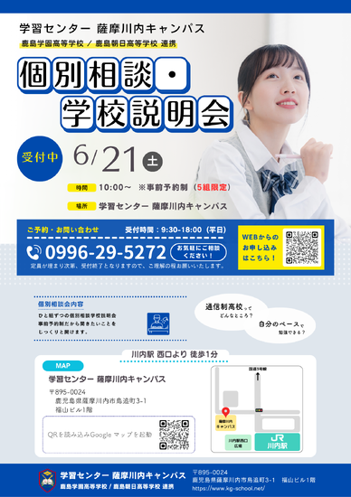 ★学校説明・個別相談会★ 2025-06-13 お知らせ 学習センター 薩摩川内キャンパス 学校説明・個別相談会を開催します。 当日は通信制の仕組み、入学から卒業までの流れ 当キャンパスのサポート内容など詳しくご説明いたします。 下記QRコードにてお申し込みください。 随時キャンパス見学も受け付けておりますので、 日程が合わない等ございましたらお気軽にお電話にてお問い合わせください。 学習センター薩摩川内キャンパス ☎(0996)-29-5272 一覧へ