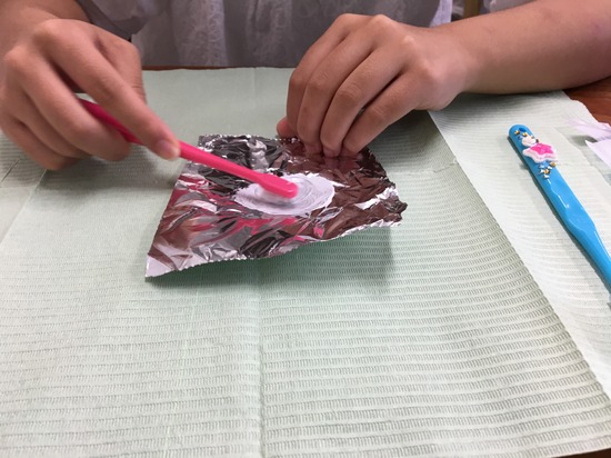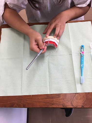 早稲田医学院 歯科衛生士専門学校の先生が、医療に関わる職業のお話と歯科器具を使った体験授業をしてくださいました。