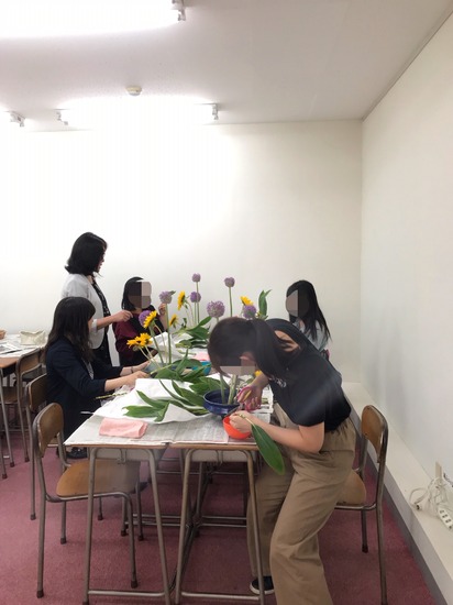 華道の先生から、道具や用語、基本の生け方の説明を受け、実際に花を生けていきます。