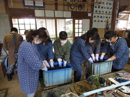 そして、藍につけます。その日によって変化をする藍。色も変わるそうです。