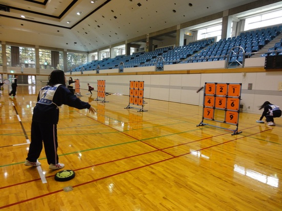 最初は、的と違う方向へ飛んでいくのが多かったのですが、徐々にコツをつかみ始めていく生徒もいて、12枚のディスクを投げる個人戦は、7枚あける生徒も!!!