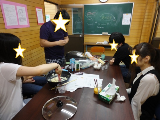 男子(若干1名)は、卵を割るのだけで大騒ぎ。