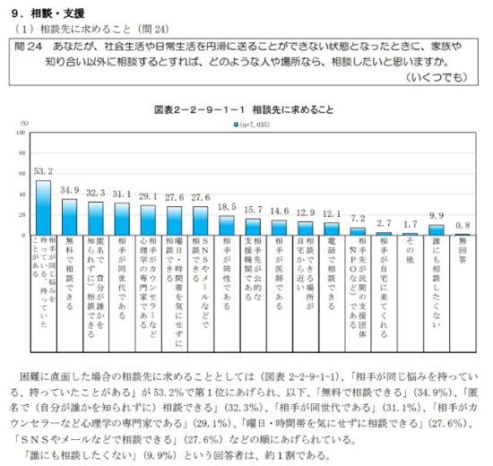 令和4年に内閣府が行った15歳から39歳の子ども・若者の意識を対象とした調査では、家族や知り合い以外に相談するとすれば、どのような人や場所なら、相談したいと思いますか。といった項目があります。