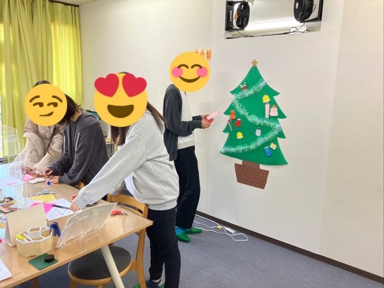 こんにちは。つくばキャンパスです。先日、生徒の皆さんとクリスマスツリーの作成を行ないました。ツリーは模造紙で作成したものを壁に貼り、そこへ折り紙で折ったものやシールなどを使って飾りつけをしました。