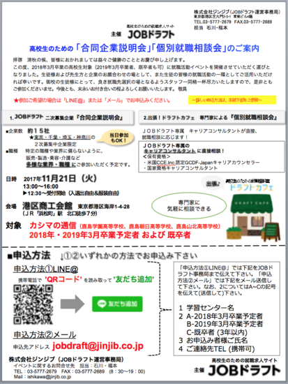 11/21(火)、高校生のための就職求人サイト「JOBドラフト」(運営:株式会社ジンジブ)が主催する就職支援イベント「合同企業説明会」「個別就職相談会」を開催します。