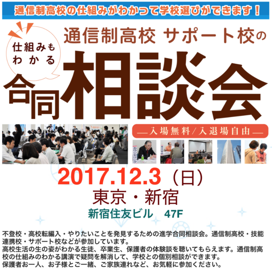 お知らせ12/3(日)、新宿住友ビル47Fで開催される「通信制高校・サポート校 合同相談会」(入場無料)に、カシマの通信(鹿島学園高等学校・鹿島朝日高等学校・鹿島山北高等学校)も個別相談ブース(事前申込不要)を出展します。