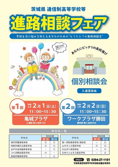 進路相談フェアに参加します! 2019.11.25 トピックス 鹿島学園高等学校が 茨城県通信制高校等 進路相談フェアに参加します。 本校への入学を検討されている方は是非お越しください。 入退室自由です! 日時:令和2年2月2日(日)11:00~15:30 場所:ワークプラザ勝田(勝田駅 東口 徒歩20分) 詳しくはこちら↓ http://ibatsuren.org/ 一覧に戻る