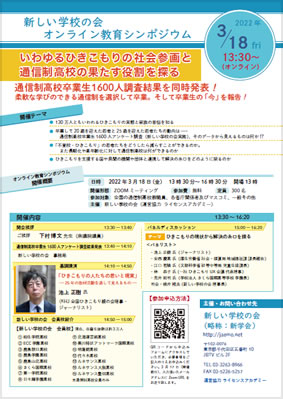 新しい学校の会 オンライン教育シンポジウムのお知らせ 2022.03.03 お知らせ 3/18に「新しい学校の会 オンライン教育シンポジウム」が開催されます。 テーマは「ひきこもりの実態と家族の苦悩を知る」「不登校・ひきこもりの若者たちをどうしたら減らすことができるか」等。 参加費無料。どなたでも参加可能。定員300名。 詳しくはチラシをご確認ください。 参加申込はチラシのQRコードから 下の画像の部分をクリック(タップ)すると、チラシが大きく表示されます。(PDF) 一覧に戻る